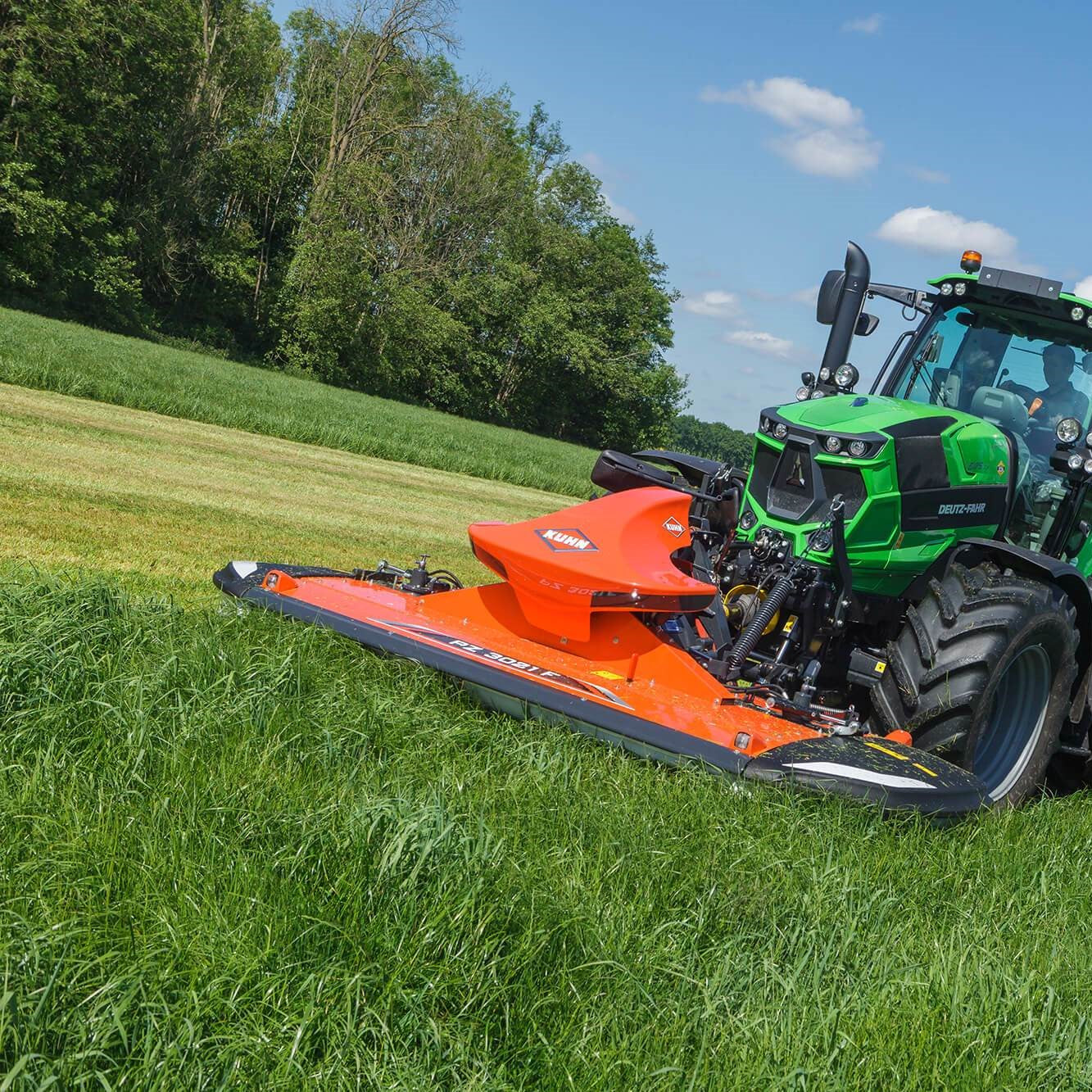 Die Fronttrommelmähwerke PZ 3021 F von KUHN stehen für optimale Mähleistungen unter anspruchsvollsten Bedingungen. Mit dem stabilen, steifen Hauptrahmen und dem robusten Antrieb eignet sich diese Baureihe vor allem für mittlere und große Schlepper.
