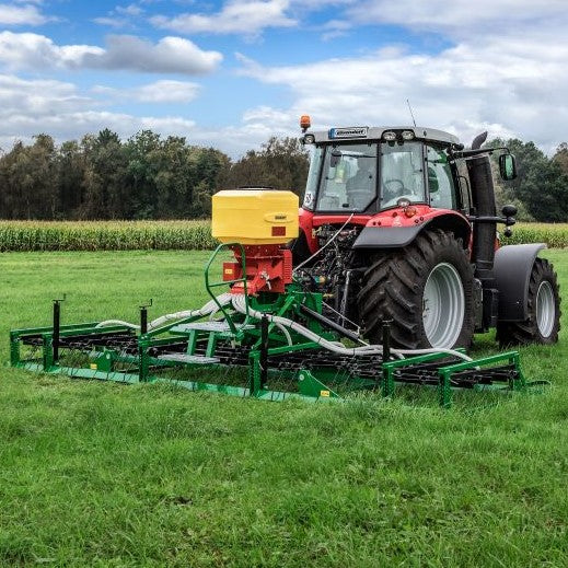 Outstanding at GREEN.RAKE classic is the double leveling bar. This serves to level unevenness even better, such as molehills or damage caused by game. The rail glides over the ground, allowing you to work without damaging the turf, even on damp or boggy areas. The intensity of the harrow pressure can be adjusted using the height adjustment using the spindle and hole pattern.