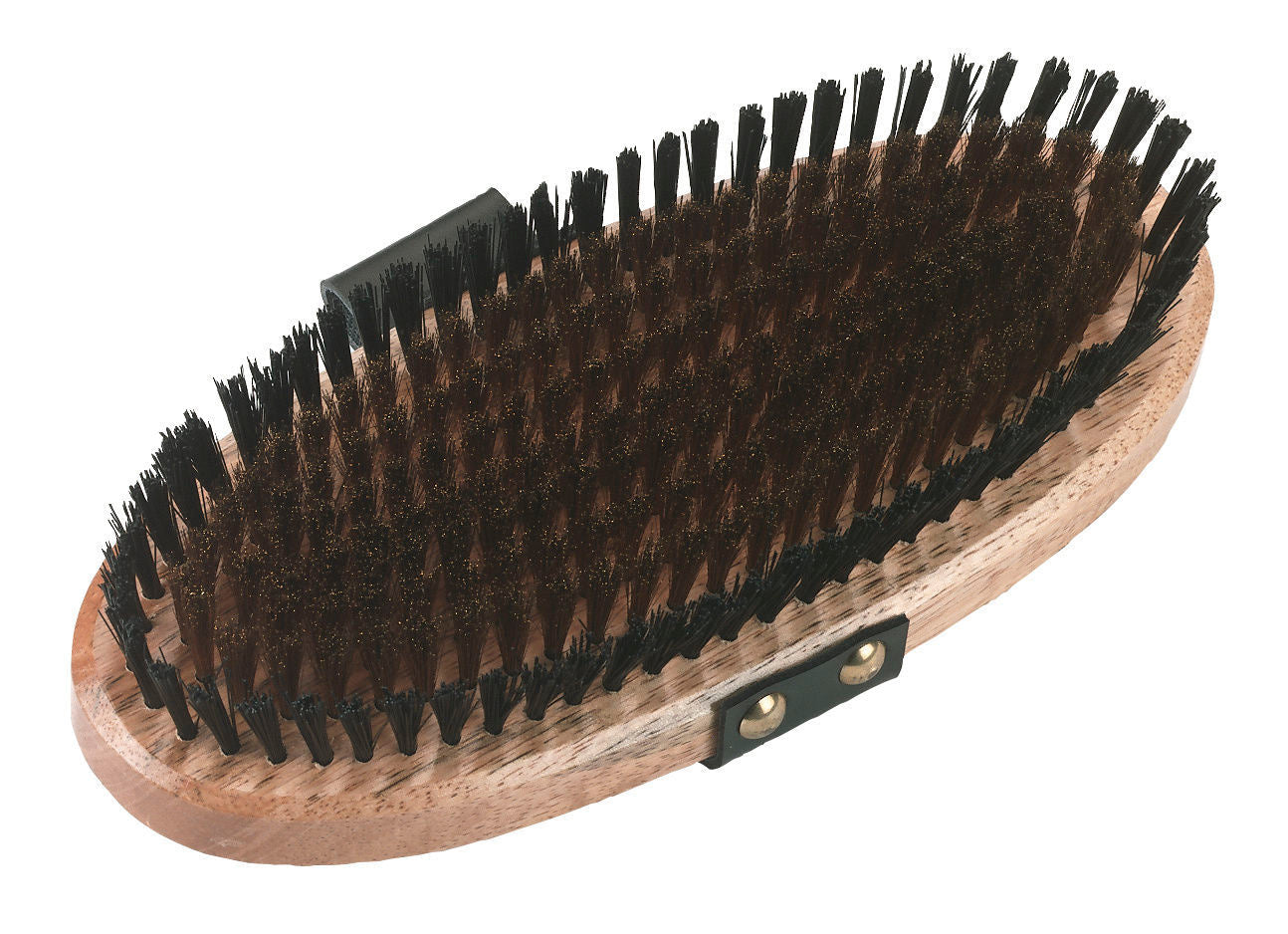 • 9-reihiges Borstenfeld, davon 7 Reihen aus gewelltem Messingdraht und 2 Randreihen aus Nylon-Borsten • Holzoberfläche lackiert • Handgurt aus Leder