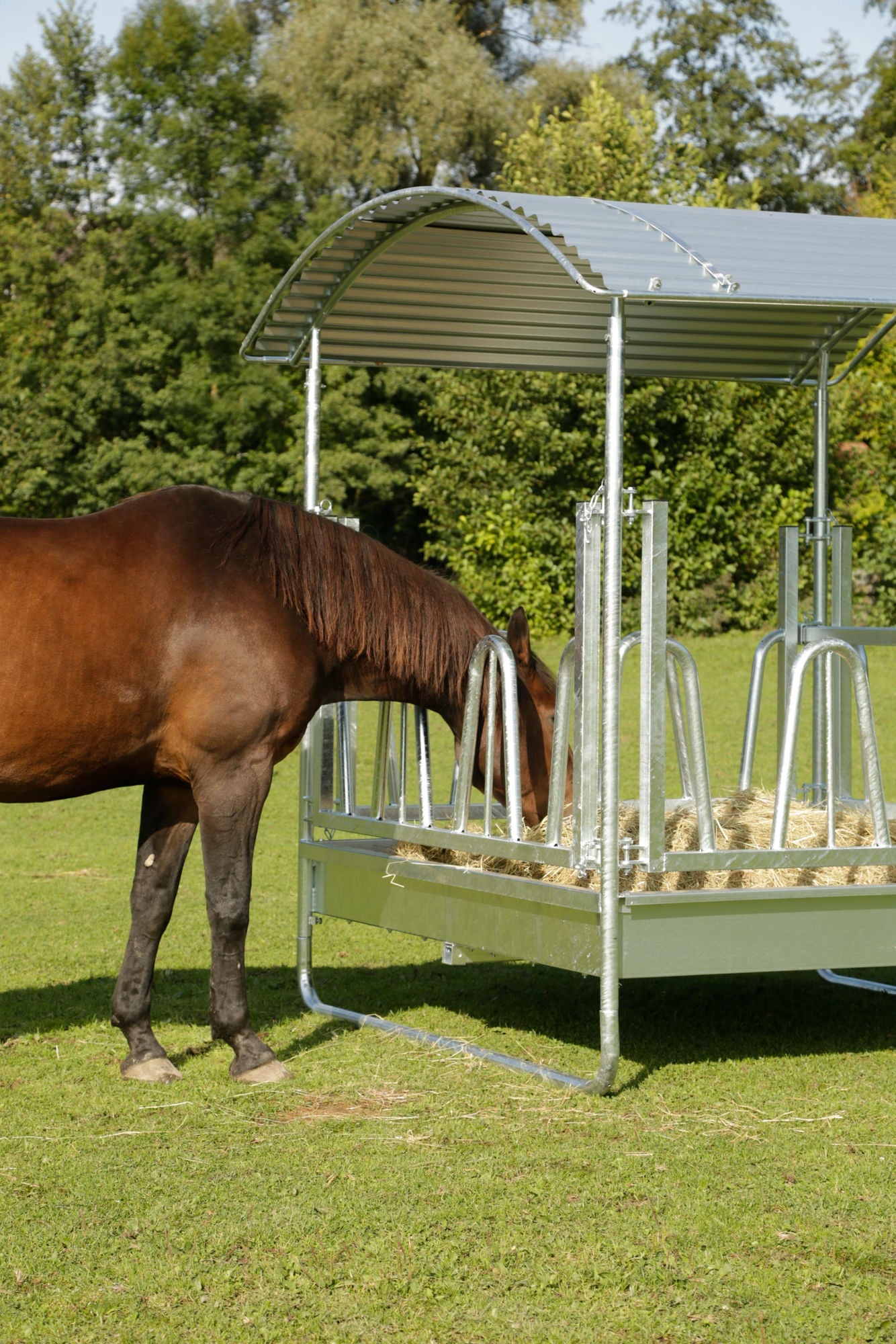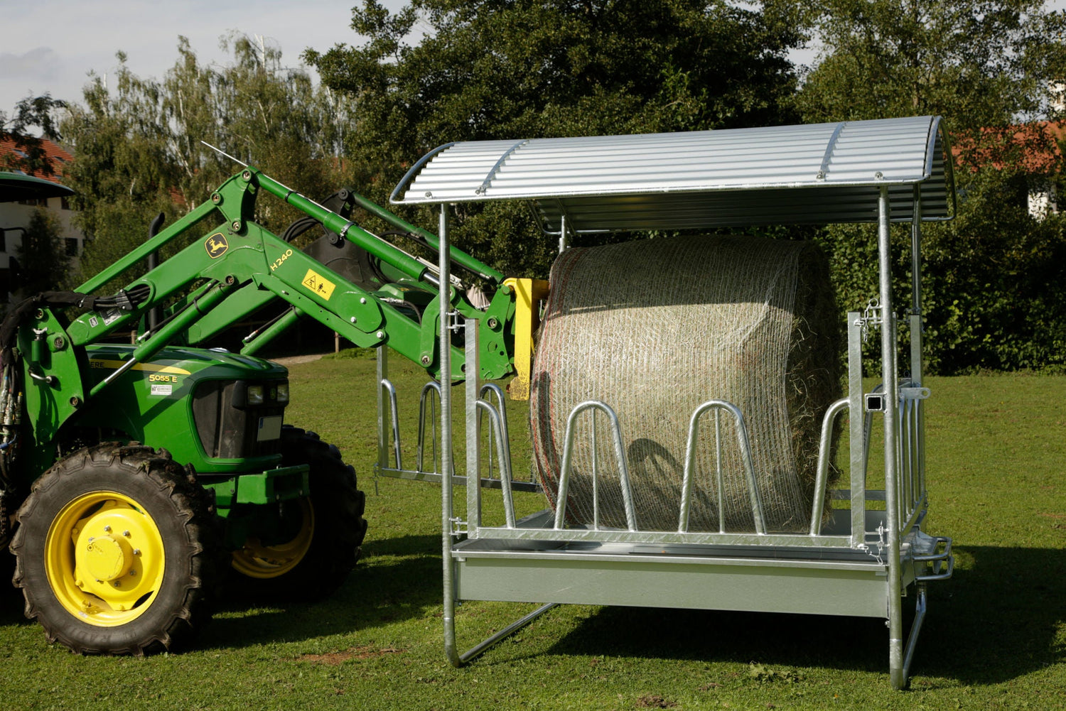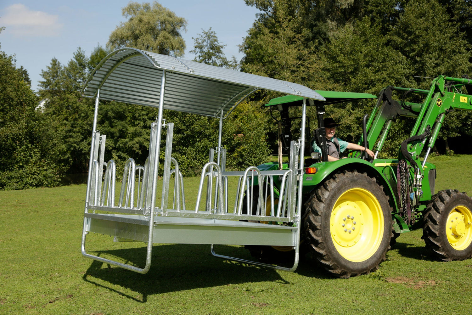 • 12 Fressplätze • geeignet für Rund- und Rechteckballen bis 1,8 m Länge bzw. Durchmesser • 1 Vierkantrohr-Unterzug • feuerverzinkt • zum Befüllen können 2 Seiten einfach geöffnet werden • höhenverstellbare Kufen (Anpassung an die Tiergröße) • Dreipunktanhängung • sehr geringe Futterverluste • Lieferung als Bausatz inkl. umlaufender Dachkantenschutz, Dreipunkt-Schutzbügel • Wannenabmessung innen: ca. 1,9 x 1,9 m • Abmessungen komplett L x B x H: 2,3 x 2,3 x 2,5 m