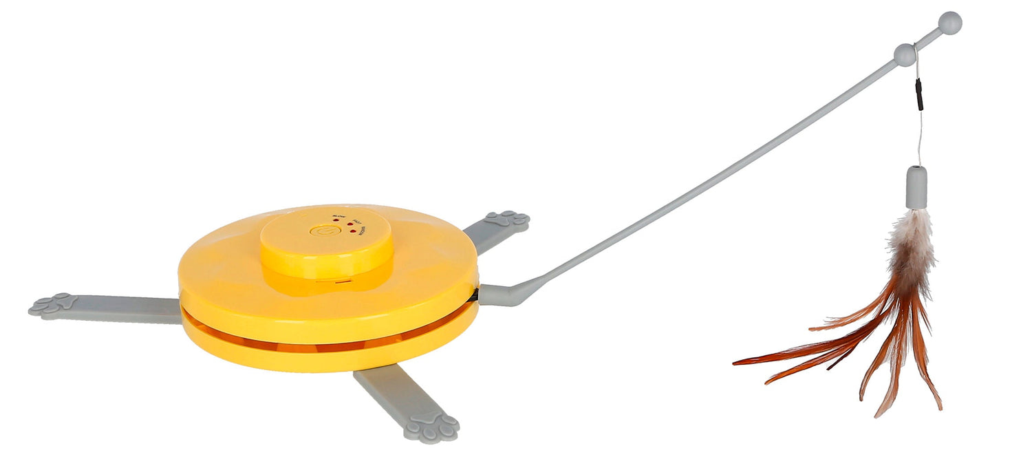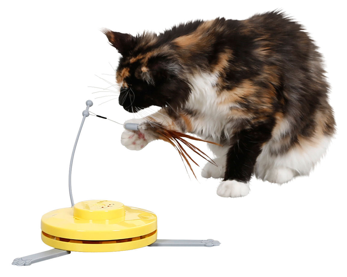 • zwei Spielmöglichkeiten wählbar - rotierender Stab unter dem Teppich - rotierender Federwedel • 3 manuell einstellbare Modi (langsam, schnell, willkürlich) • fördert den Spieltrieb und die Reaktionsfähigkeit Ihrer Katze • strapazierfähiger, robuster Nylonteppich mit Raschelfunktion • stabiler, flexibler Plastikstab • automatische Abschaltfunktion nach 15 Minuten • fester Stand durch rutschhemmende, ausklappbare Füße • für 3 x AA Batterien (im Lieferumfang nicht enthalten)