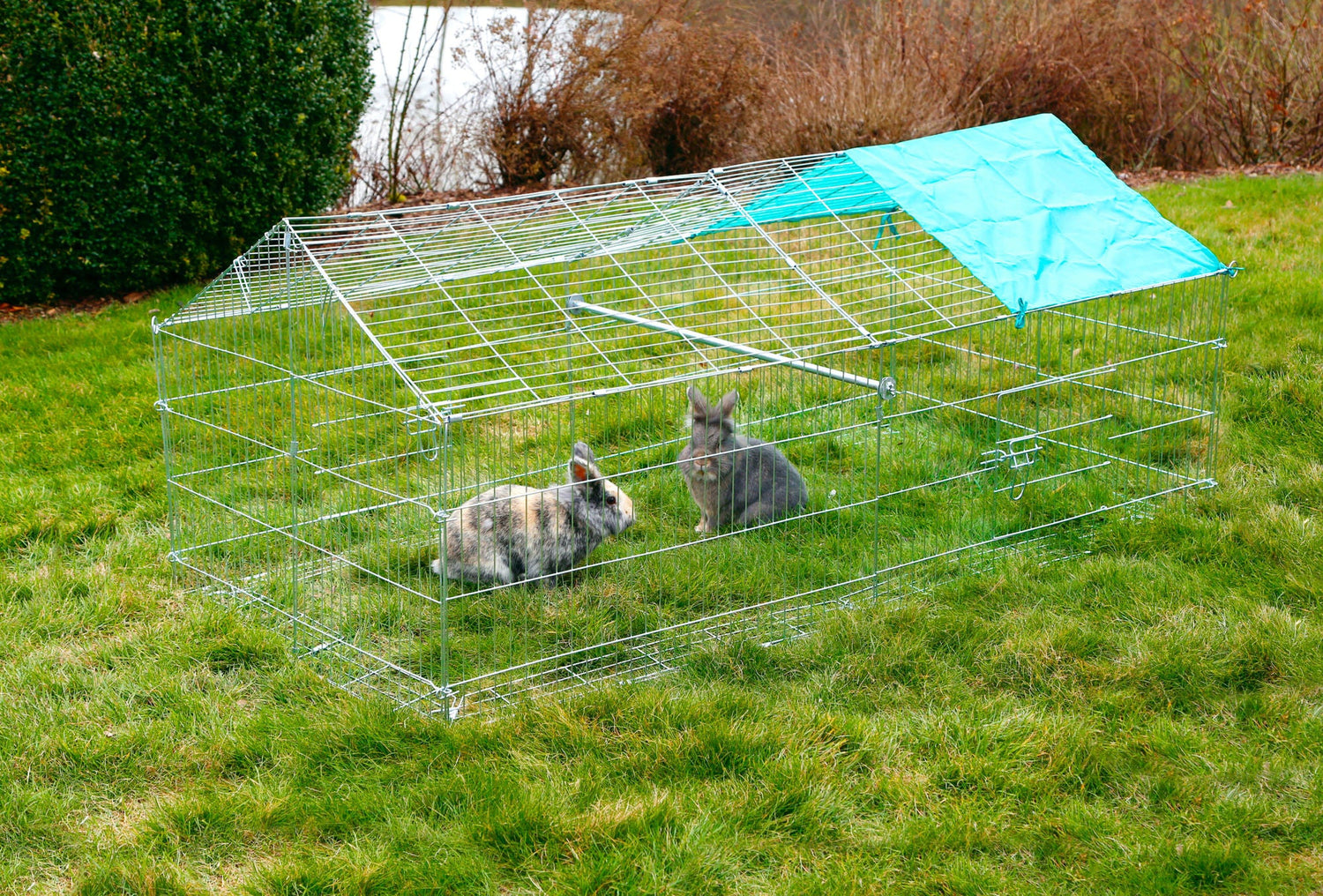 • verzinkte Ausführung • inkl. Sonnenschutz • Sitzstange • mit 2 Türen • Gitterabstand beträgt 3 cm • einfache Montage mit Erdspießen