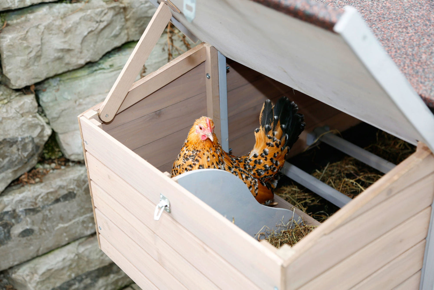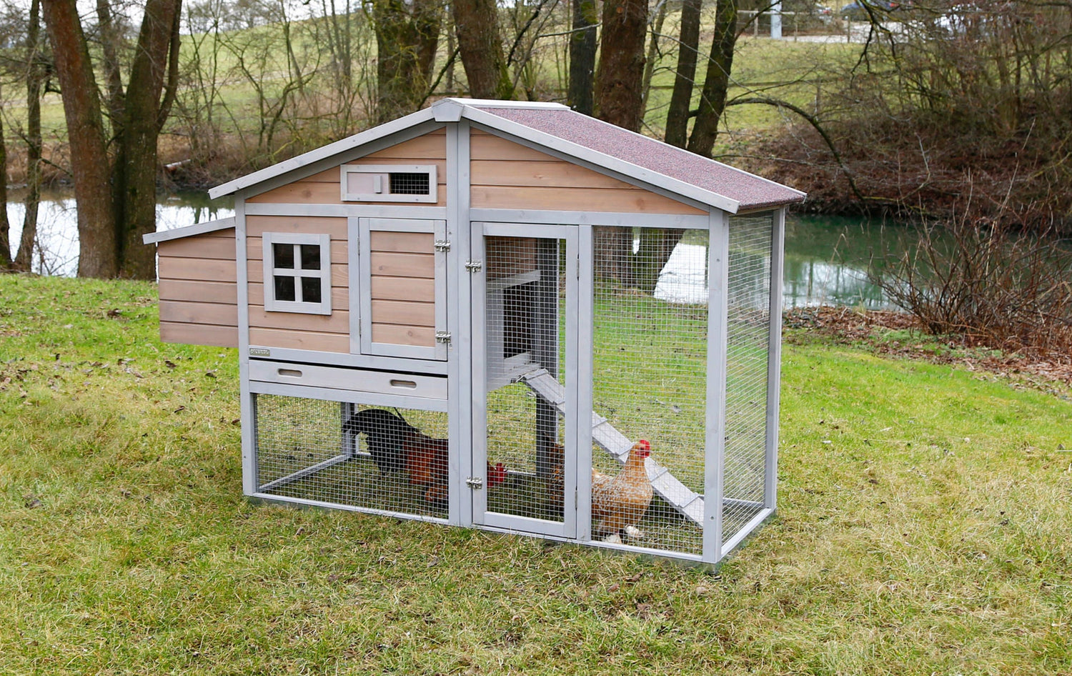 • aus hochwertiger Spießtanne • mit Schiebefenster für variable Luftzirkulation • Metallrahmen am Boden schützt vor Feuchtigkeit und Verfall des Holzes • erhöhte Sicherheit durch zusätzliche Verschlüsse pro Türe • Absperrmöglichkeit zwischen dem Freilaufgehege und dem Ruheplatz • Maße Ruheplatz: 67 x 56 cm • inkl. 2 Legenestern und 2 Sitzstangen • stabile Ausführung • 5 cm hohe Kunststoffwanne zum Herausziehen erleichtert die Reinigung • mit Holzschutzfarbe lasiert • wetterfestes Bitumendach • Lieferung zerlegt im Karton • einfache Montage, inkl. Aufbauanleitung