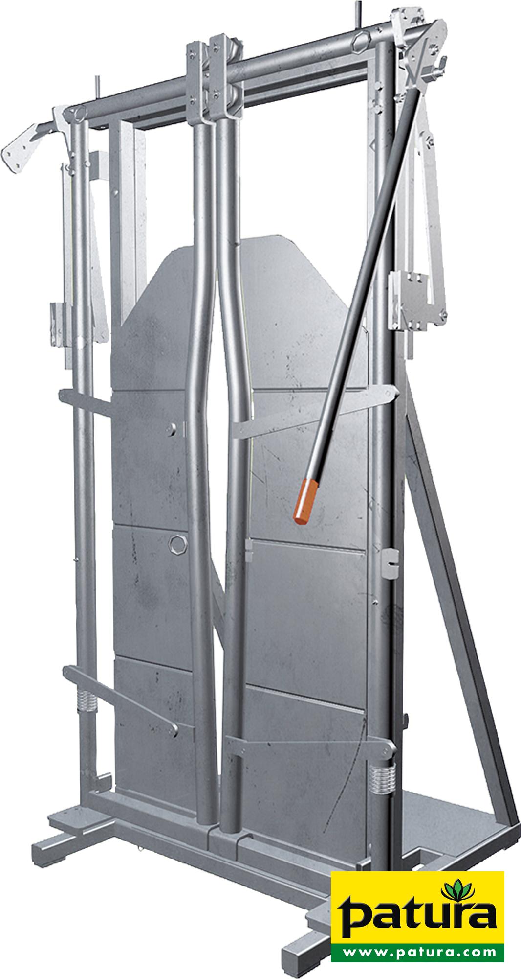 Patura Halsfangvorrichtung A4000 mit Ständer, mit automatischer Bremse. Halsfangvorrichtung A4000. mit Ständer, stufenlose Halsfangvorrichtung A3500 12  85 cm mit automatischer Bremse, inklusive Kopf-Fixierkette, verzinkt, L x B x H: 100 x 140 x 217 cm.