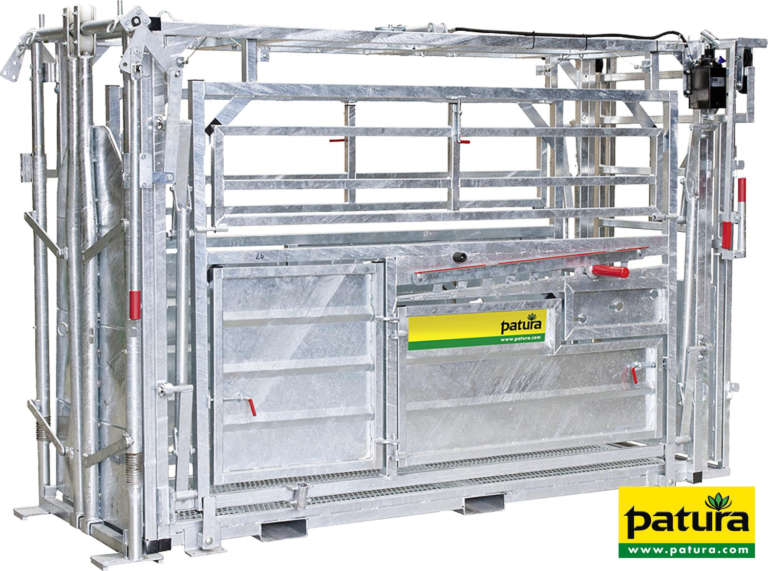 Patura Behandlungsstand A8000 mit Seitenverengung, Heckschiebetüre. Behandlungsstand A8000. feuerverzinkt, stufenlose Halsfangvorrichtung A3500, beidseitig je 3 Seitentüren, doppelseitige, parallele Seitenverengung, Heckschiebetüre, inklusive Kopf-Fixierkette.