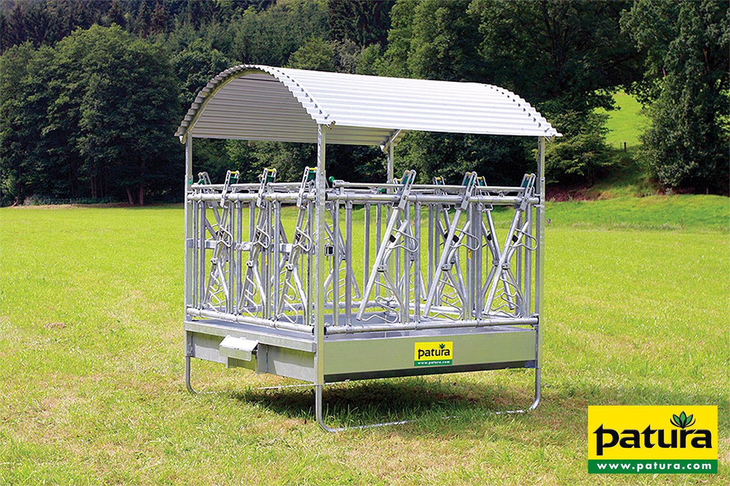 Patura Profi-Viereckraufe mit Sicherheits- Fangfressgitter und Dach. Profi-Viereckraufe mit Sicherheits-Fangfressgittern.  12 Fressplätze  Sicherheits-Fressgitter zum kurzzeitigen Fixieren hornloser Rinder  Dreipunktanhängung  Doppelte Verstärkungsrohre  Innenmaße: 2,00 x 2,05 m  Fresshöhe: 76 cm  Dach höhenverstellbar  Nur für ausgewachsene, großrahmige Rinderrassen.
