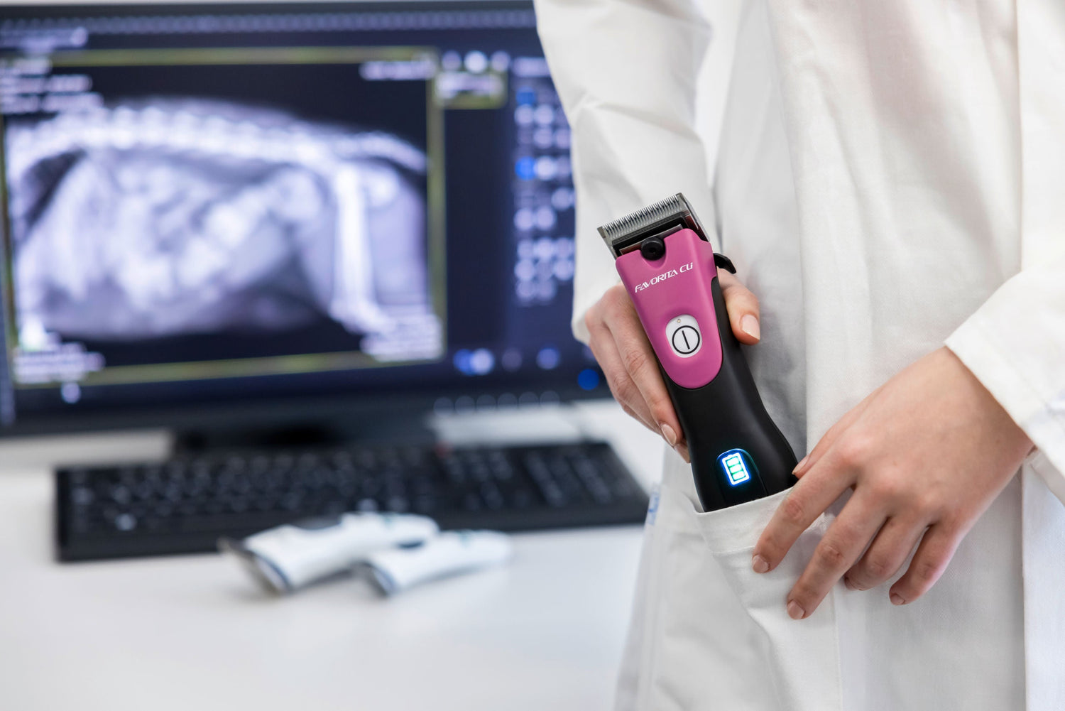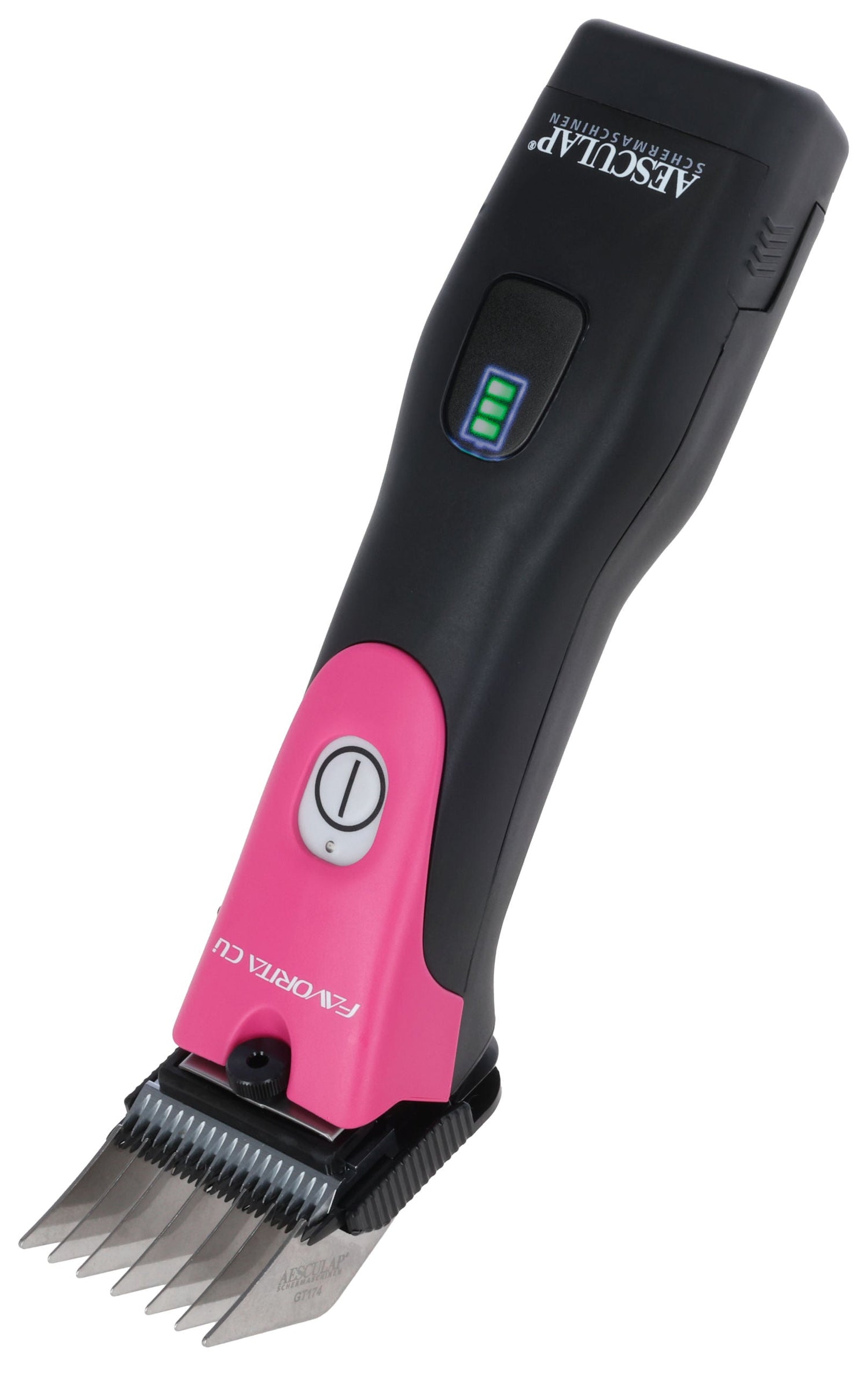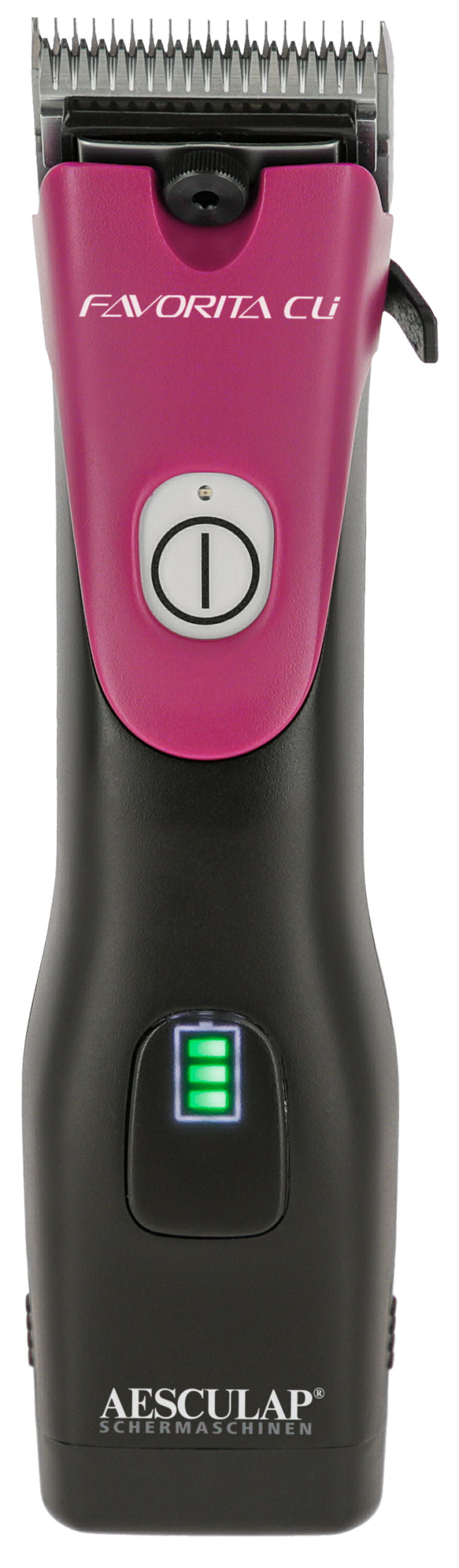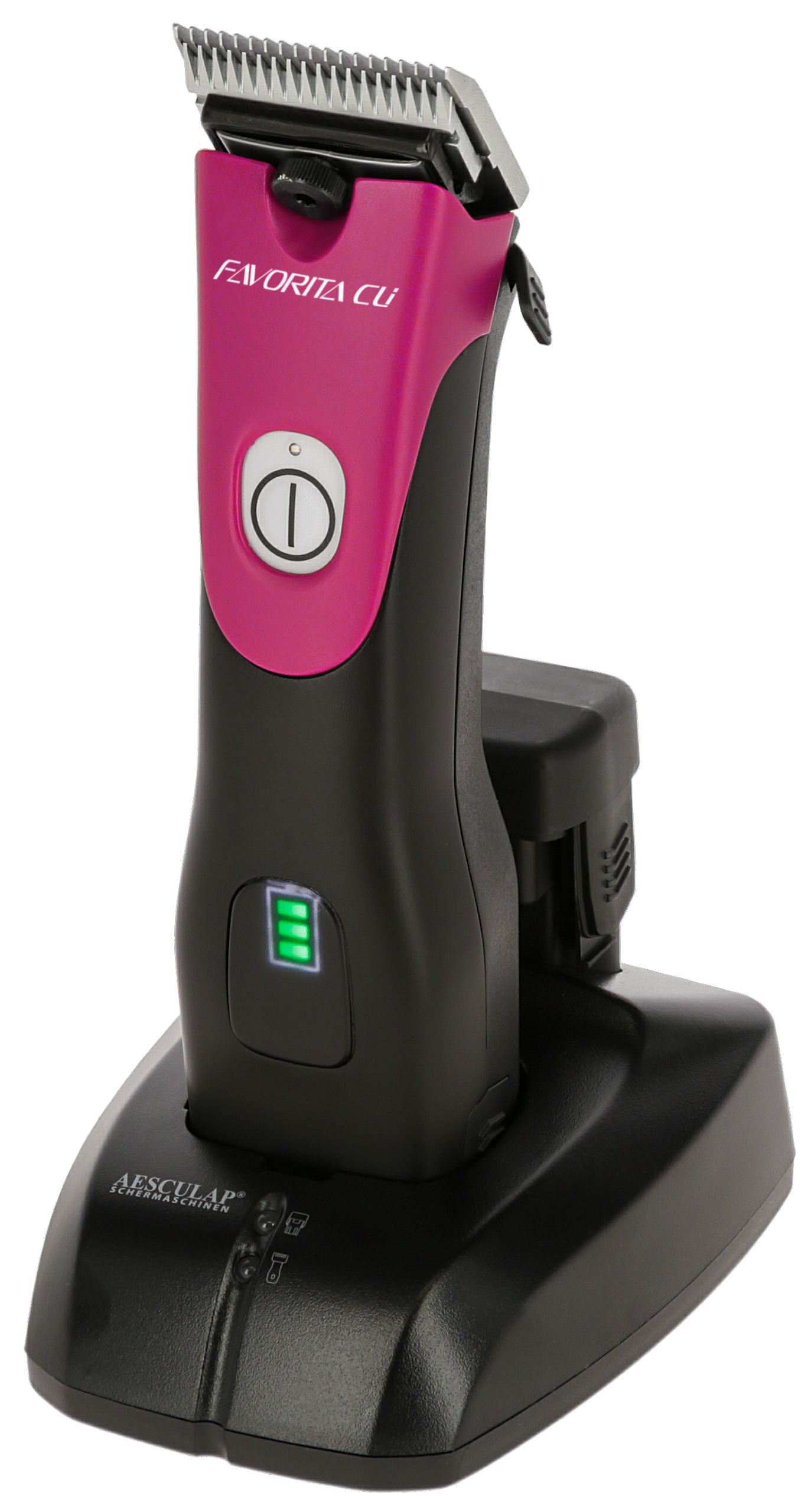 Aesculap Favorita Cli, 1 Akku Telemagenta - GT234-TM: inkl. Favorita Info-LED: jederzeit informiert über den Betriebszustand von Akku und Gerät!·enorme Durchzugskraft mit 3.300 Hüben, dank hochwertigem bürstenlosen Motor·Li-Ionen Akku der neuesten Technologie garantieren extrem lange Einsatzzeiten im Vergleich zum Vorgängermodell·ergonomisch und perfekt ausbalanciert·Gewicht von nur 390 g für ermüdungsarmes Arbeiten·Ladestation mit LED-Anzeige und Ladeschächten für Maschine und Ersatzakku·Lieferung ohne Scherkopf
