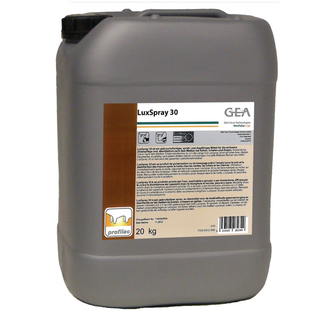 Original GEA Farm Technologies LuxSpray 30 Dippmittel 20 kg Kanister. SKU 7724-5312-000. Jetzt online bestellen bei Neyer Landtechnik, deinem autorisierten GEA Solution Center. Entdecke zahlreiche Ersatzteile und Verschleißteile in unserem GEA Online-Shop.