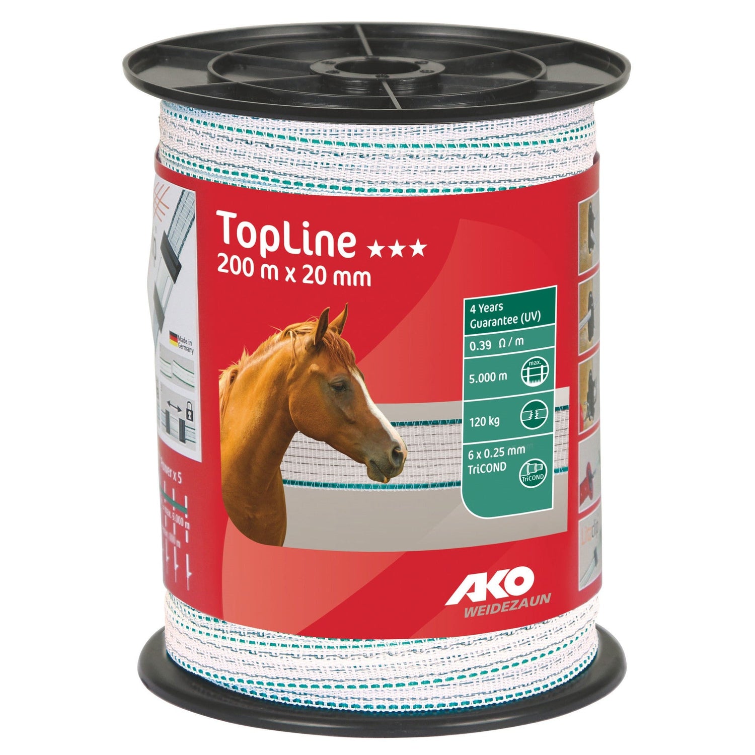 • Breite: 20 mm • Länge: 200 m • Spezifikation: 6 x 0.25 mm TriCOND • Widerstand Ohm/m: 0.429 • max. empf. Zaunlänge: 4.000 m • siehe Seite 75